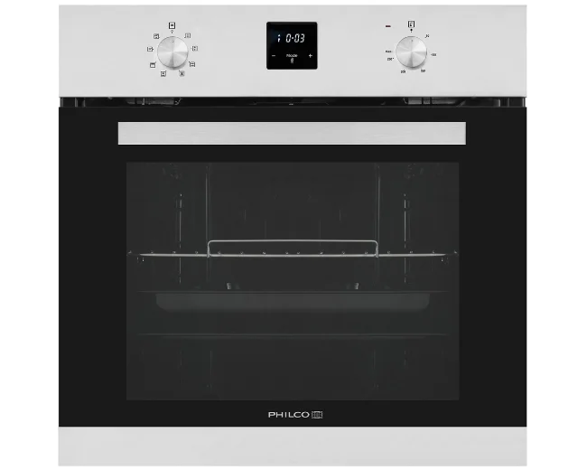 Vestavná multifunkční trouba Philco POB 698 X v nerezovém provedení o objemu 69 litrů s funkcí minutky a bílým displejem má až 8 funkcí, lze ji nastavit v teplotním rozsahu 50 – 250°C.