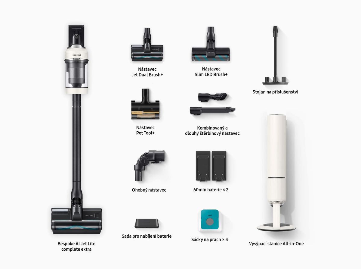 *Motor BESPOKE AI Jet Lite = 115 g, motor VS9000 = 205 g, motor VS9700 = 150 g. **10letá záruka na díly nezahrnuje náklady na práci a vztahuje se pouze na digitální invertorové motory prodávané od ledna 2023. Úplné znění podmínek najdeš online. ***Na základě testování společností SLG Prüf- und Zertifizierungs GmbH v souladu s normou IEC 62885-4 Cl.5.8. Měřeno na vstupu nemotorového nástavce s prázdnou prachovou nádobou, při použití režimu Jet a při plně nabité baterii s dostatečnou kapacitou. Výsledky se mohou v závislosti na skutečném způsobu použití lišit.