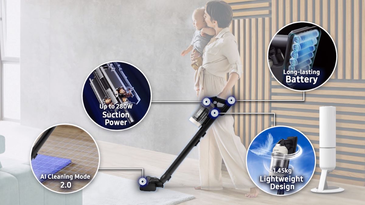 Užívej si efektivní a chytré vysávání bez námahy a dráždivých alergenů. Lehký tyčový vysavač Bespoke nabízí silný sací výkon až 280 W*. Režim AI Cleaning 2.0 se přizpůsobí každému povrchu*** a HEPA filtr zachytí i jemný prach****, který by jinak poletoval ve vzduchu